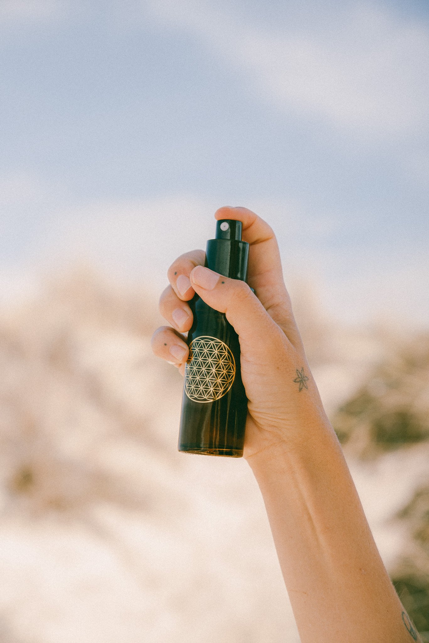 Elaborados con esencias sagradas egipcias, aceites esenciales de Young Living, aceite de jojoba ecológico, agua destilada, alcohol y cristales, cada spray sostiene una frecuencia específica según su intención.