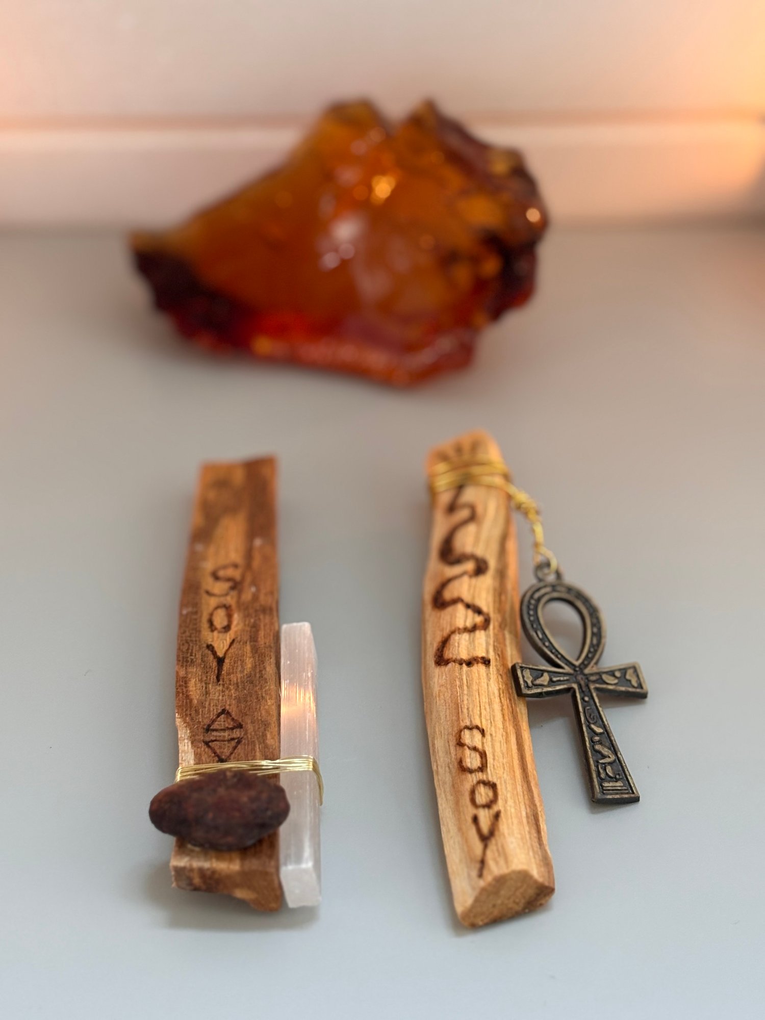 Palo santo grabado con símbolos de poder, creado para potenciar la purificación y la conexión espiritual.